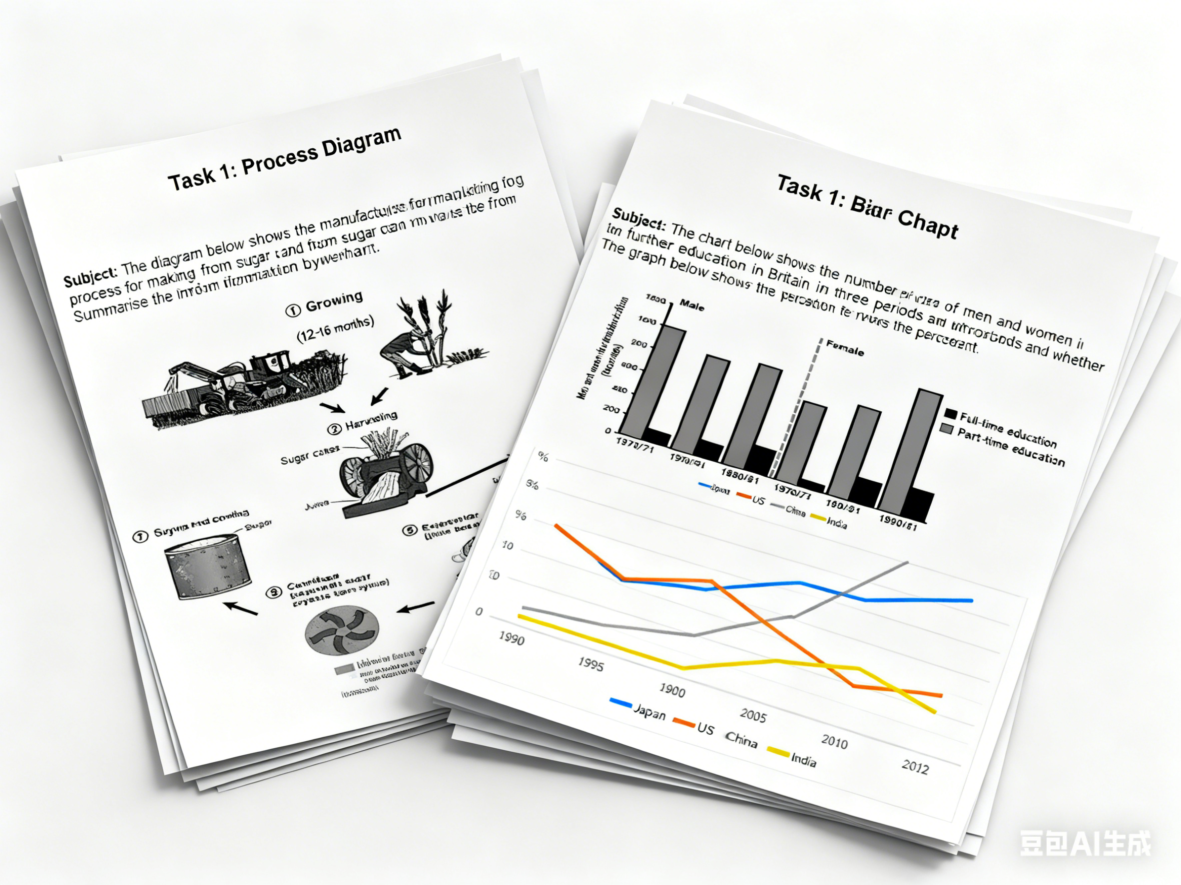 - 题材全面:涵盖柱状图、折线图、饼图、表格、工艺流程图等常见Task 1题型。