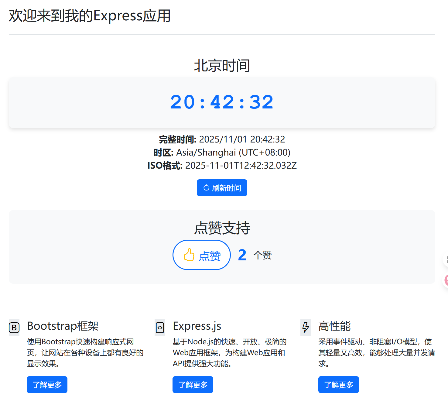 | <!DOCTYPE html> <html lang="zh-CN"> <head> <meta charset="UTF-8"> <meta name="viewport" content="width=device-width, initial-scale=1.0"> <title>我的Express应用</title> <link rel="stylesheet" href="/css/bootstrap.min.css"> <link rel="stylesheet" href="/css/bootstrap-icons.css"> <style> body { padding-top: 20px; } .feature-icon { width: 4rem; height: 4rem; border-radius: .75rem; } .clock-container { text-align: center; margin: 30px 0; } .digital-clock { font-size: 3rem; font-weight: bold; font-family: 'Courier New', monospace; color: #0d6efd; background-color: #f8f9fa; padding: 20px; border-radius: 10px; box-shadow: 0 4px 8px rgba(0,0,0,0.1); } .time-info { margin-top: 10px; font-size: 1.2rem; } .thumbsup-container { text-align: center; margin: 30px 0; padding: 20px; background-color: #f8f9fa; border-radius: 10px; } .thumbsup-btn { font-size: 1.5rem; padding: 10px 20px; border: 2px solid #0d6efd; background-color: white; color: #0d6efd; border-radius: 50px; cursor: pointer; transition: all 0.3s ease; } .thumbsup-btn:hover { background-color: #0d6efd; color: white; } .thumbsup-btn:disabled { background-color: #6c757d; border-color: #6c757d; color: white; cursor: not-allowed; } .thumbsup-count { font-size: 2rem; font-weight: bold; color: #0d6efd; margin: 0 15px; } .thumbsup-icon { color: #ffc107; font-size: 1.8rem; } .feedback-message { margin-top: 10px; font-weight: bold; } .success { color: #198754; } .error { color: #dc3545; } .info { color: #0d6efd; } </style> </head> <body> <div class="container"> <header class="d-flex align-items-center pb-3 mb-5 border-bottom"> <h1 class="h2">欢迎来到我的Express应用</h1> </header>